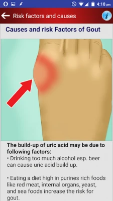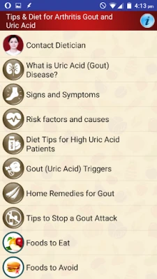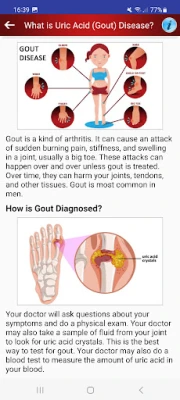 Arthritis Gout Uric Acid Diet is a free app containing information about gout arthritis or high uric acid disease symptoms causes treatment diet & food tips. Gout is a kind of arthritis caused by a high buildup of uric acid crystals in the joints. Uric acid is a breakdown product of purines that are part of many foods we eat.